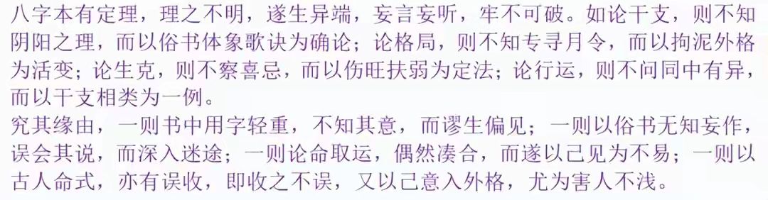 八字本身自有定理,道理没有搞明白,就会生出一端之说,乱说乱听就难以改变。如论天干地支,却不知阴阳的本质,而以俗书中体象歌诀为正确的论调;论格局,却不知道专用月令上定格取用,而是拘泥于外格作为灵活的方法;论生克关系,却不看喜忌,而以伤害旺神扶助弱神为一定的方法;论行运,却不看相同的五行有阴阳之别,天干地支之别,而以干支相类似也作为一例。 究其缘由,一则是书中用字含义的轻重,个人理解上有差异,而产生偏见;一则是俗书无知又乱写,错误的领会其中的说法,而深入迷途;一则是论命取运的时候,偶然地能用自己的偏见解释,于是就深信不疑;一则是以古人的命例,也有一些收录了一些不符合现实情况的命例,又用自己的理解把它放进了外格中,尤其害人不浅。 比如壬申癸丑己丑甲戌这个命例,己土生丑月,透壬癸正偏财于年月干,为杂气偏财格,也十干又有甲木正官,因此为财旺生官格。但有人偏偏以为时辰有误,应该是乙亥时,时上偏官去论的话才合理。却不知财旺生杀,已经破格到影响其人的安危,从哪里取贵呢?此类命例很多,都是错误收录的格局论。 比如己未壬申戊子庚申这个命例,戊生申月,透庚食壬财于月时干,地支申子会成水局,为食神生财格,但有些人却放弃月令,以为戊日庚申时为合禄的格局,却不知本身已经有了财星食神,难道不好吗?又何必以庚合乙,求局外的官星呢,这类命例也很多,都是牵强录入外格的。 人们没有一定的主见和判断力,对理论的理解不够精深,看到此类谬论,难道不会迷惑?何况最近也有一些贵格的八字不能用过去理论解释的,这种情况很常见吗?岂知看八字的人,必定以贵命命例作为归宿和方向,或者将听到的作为实在的证据,或探问其人生日,却不知道时辰,而以自己的理解去增加时辰,胡乱制造贵格,其人的八字,时辰多半没有确定,就算是本人,有些人也不清楚自己的时辰。如果看八字的人不久追究其中本质,而只是以这个人既然富贵就牵强附会地从理论强行解释,那就一辈子都搞不明白了。
